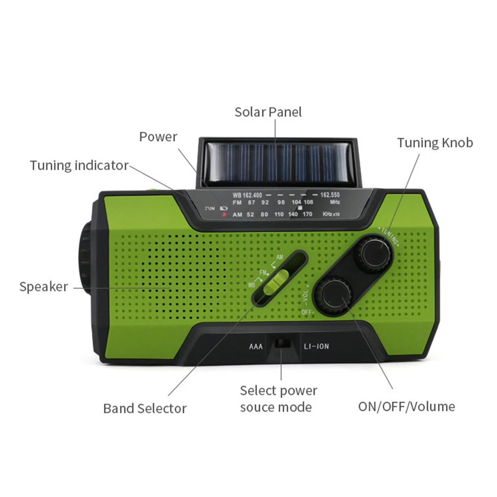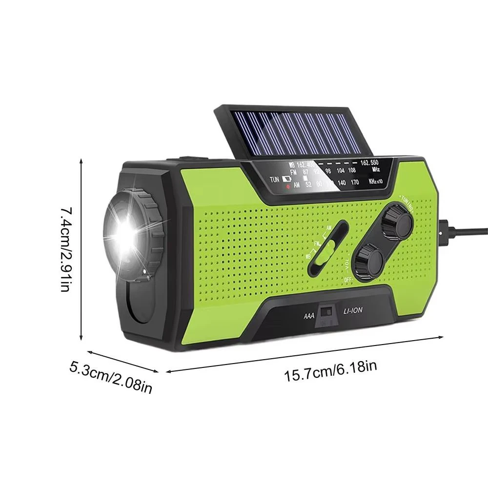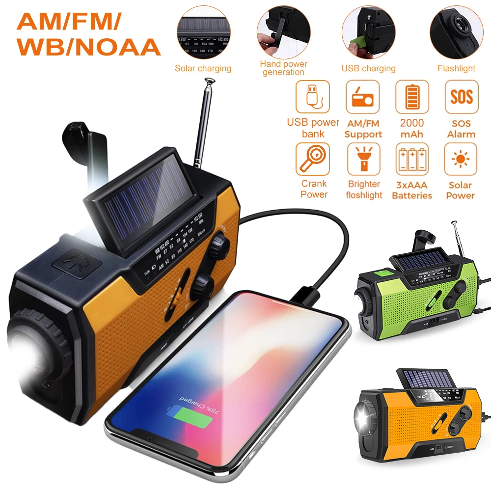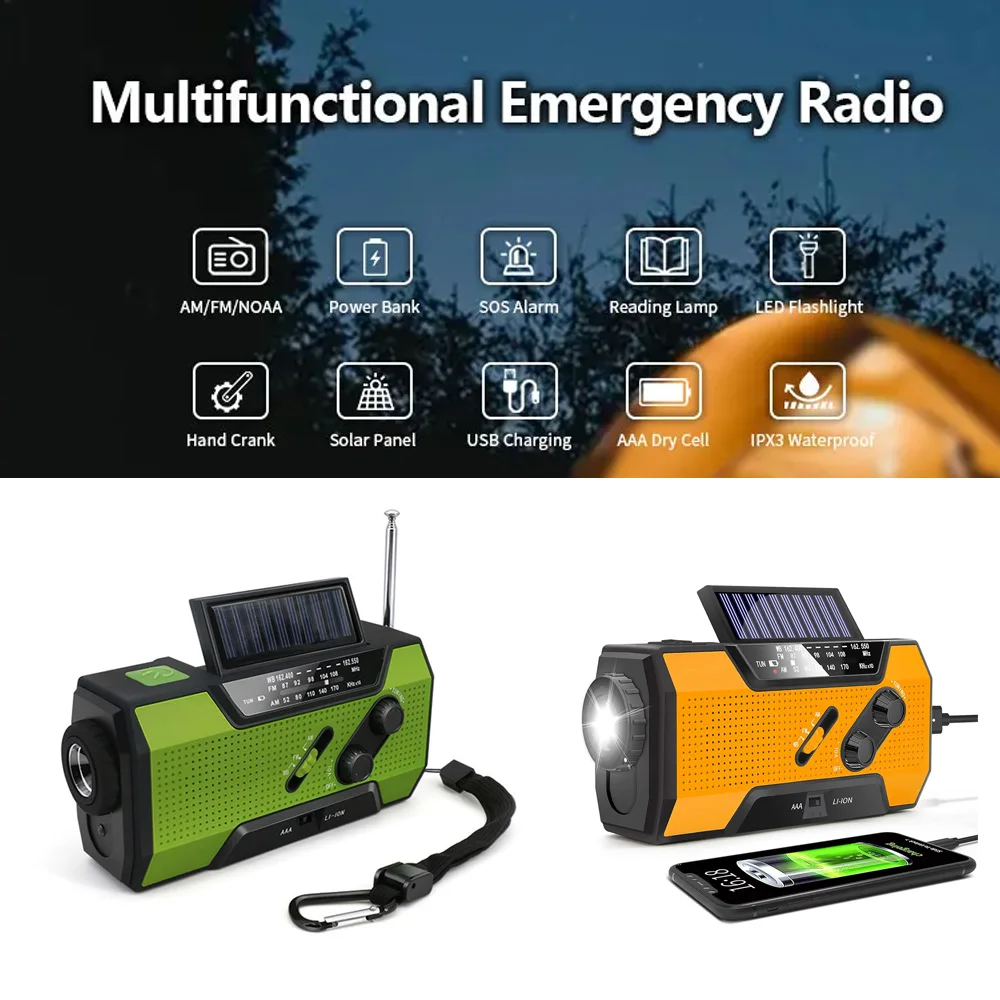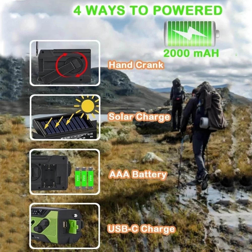 Rádio de Emergência com Bateria de 2000mAh — Rádio Portátil, Power Bank, Carregamento USB/Solar/Manivela, Alimentação por Bateria e Alarme SOS