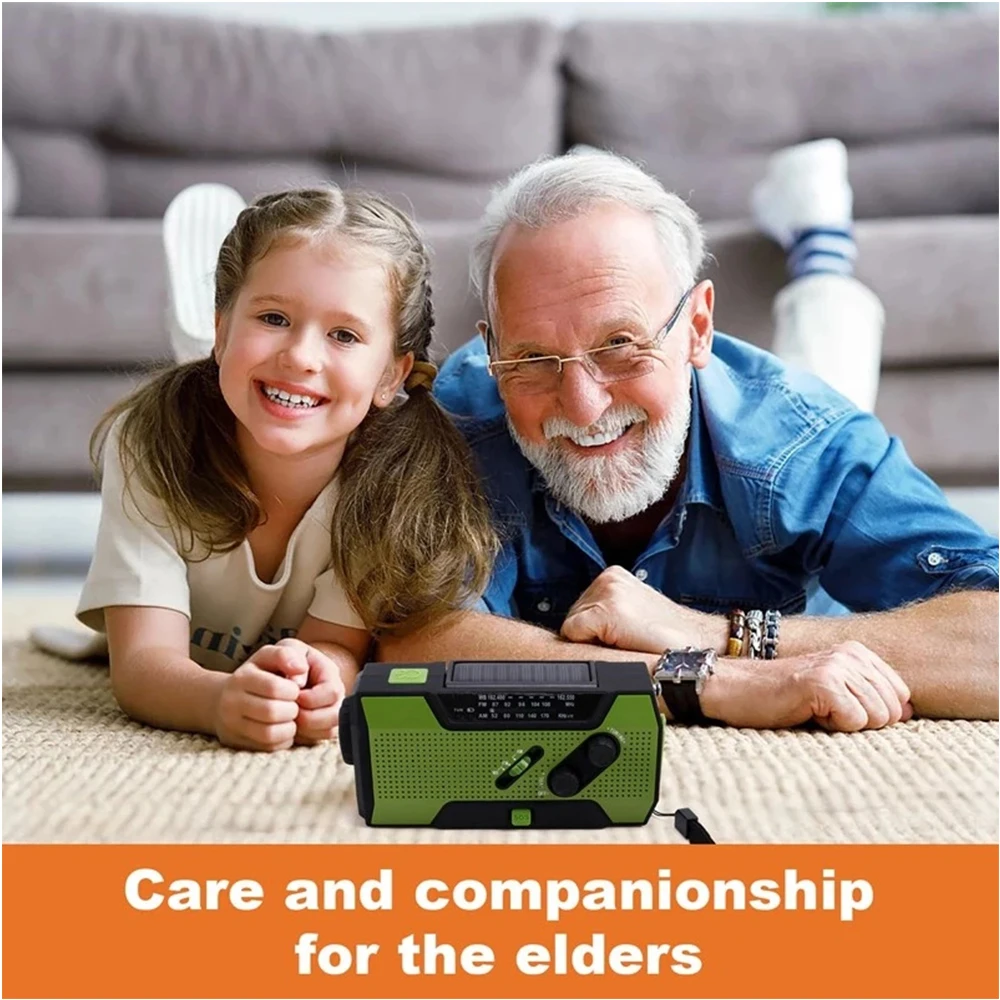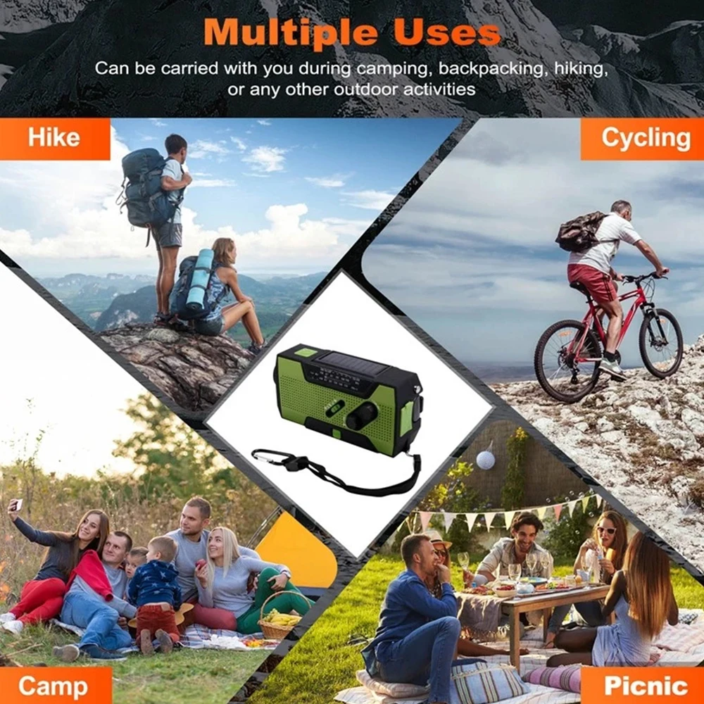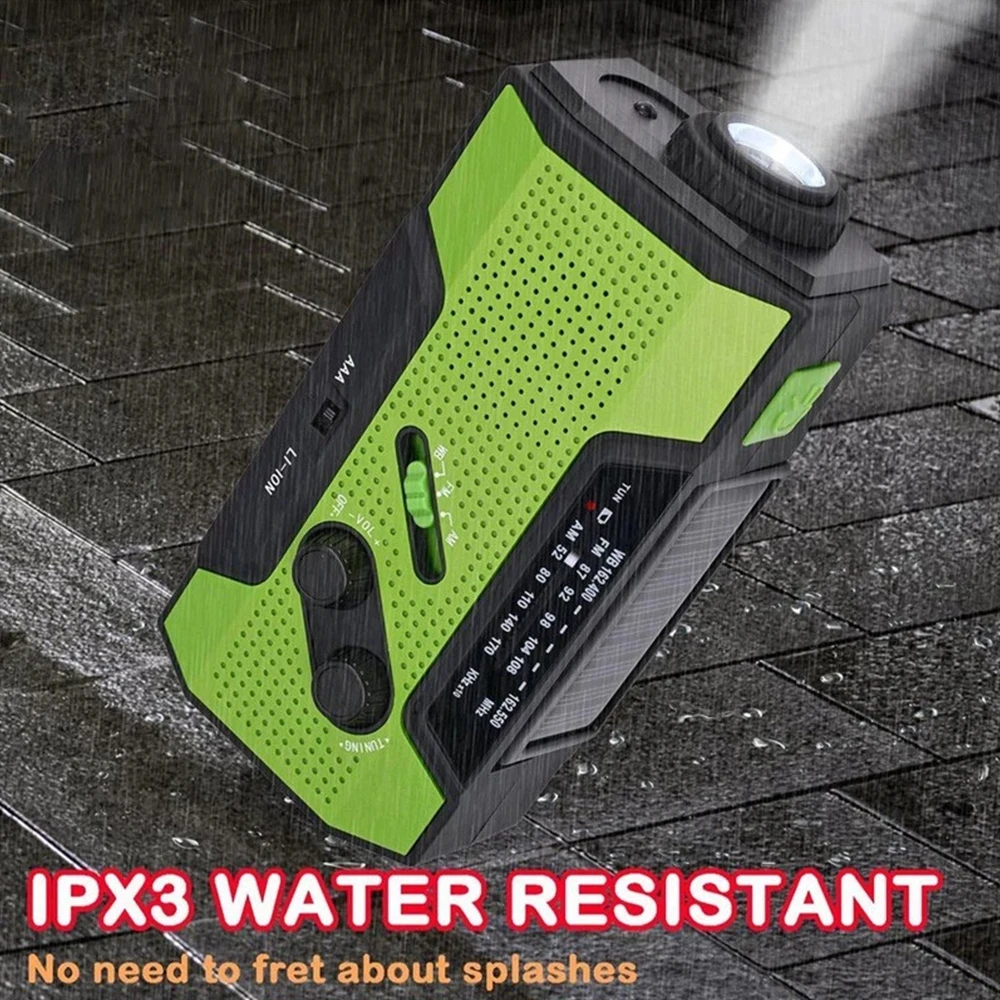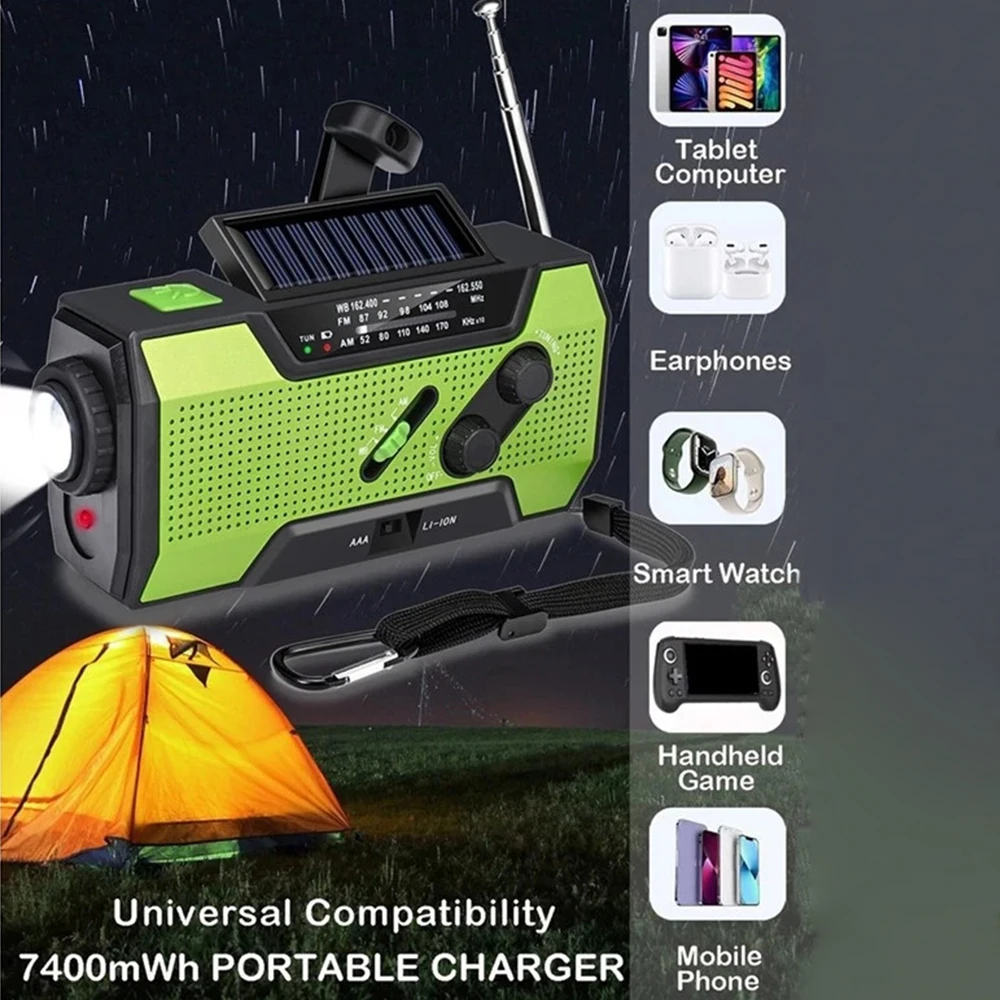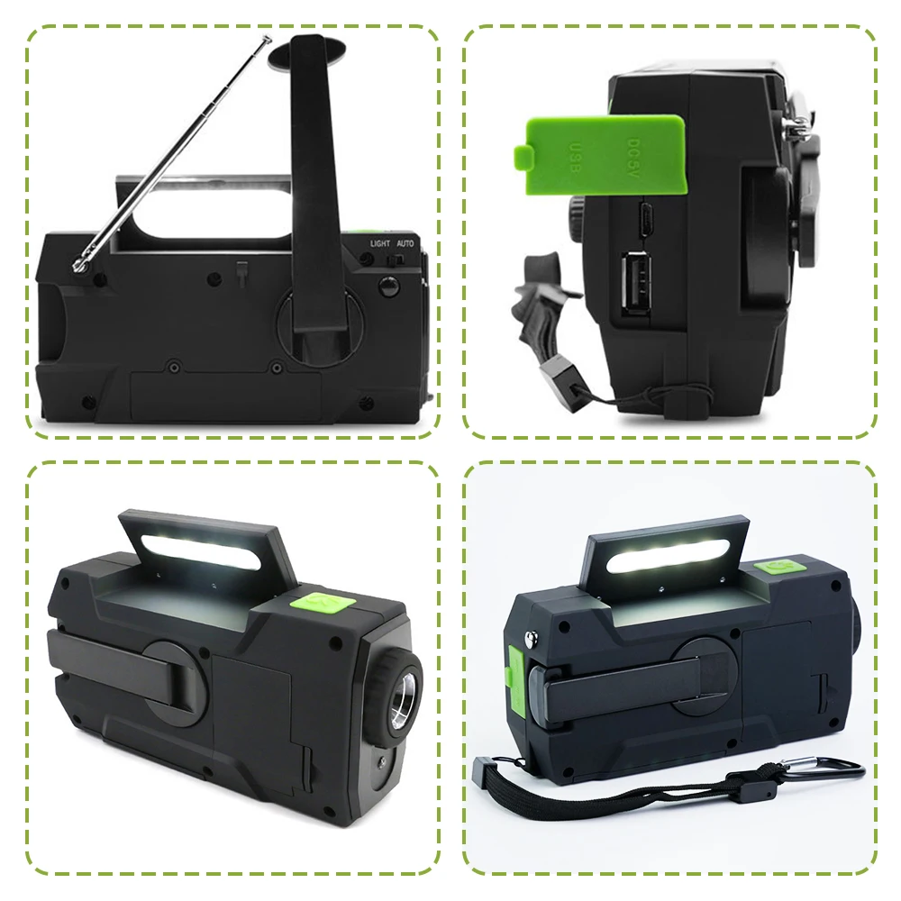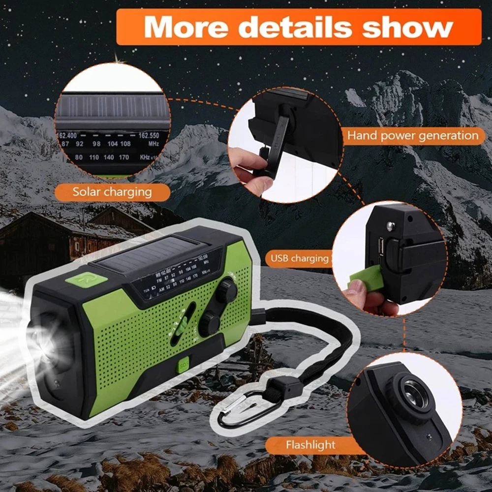 Rádio de Emergência com Bateria de 2000mAh — Rádio Portátil, Power Bank, Carregamento USB/Solar/Manivela, Alimentação por Bateria e Alarme SOS